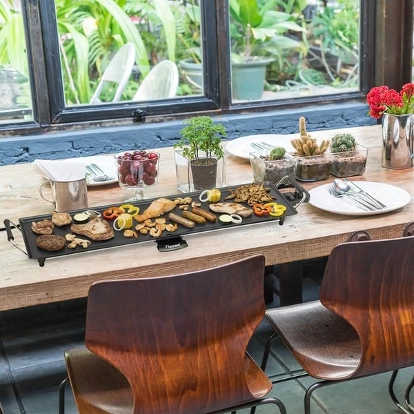 Die Bestron ABP604 Plancha Grillplatte XXL ist eine hochwertige Backplatte mit Antihaftbeschichtung (Größe 90,5 x 23,7cm) und eignet sich ideal für z.B. Fleisch, Fisch, Gemüse und Kartoffeln. Der abnehmbare einstellbare Temperaturschalter besitzt eine Kontrollleuchte. Zum Betrieb ist kein Öl oder Fett notwendig, die Auffang-Rinne und -schale nimmt überschüssiges Fett oder Grillrückstände auf. Die ABP604 Plancha Grillplatte XXL ist leicht zu reinigen und kann im Innenbereich und geschützt im Freien verwendet werden.Art.-Nr.: 1432124