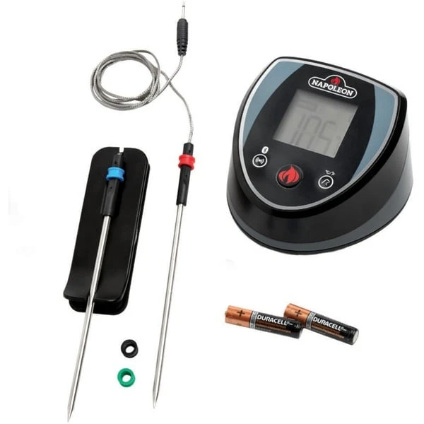 Das Bluetooth Thermometer von Napoleon misst mit 2 Temperatursonden die Kerntemperatur sowie Garraumtemperatur, so dass man stets bequem und einfach evtl. Temperaturschwankungen erkennen und ausgleichen kann. Praktischerweise können die Messwerte entweder direkt am Thermometer auf einem großzügigen Display abgelesen werden oder komfortabel auf dem Smartphone mit Hilfe der ACCU-PROBE App (Apple OS und Android) angezeigt werden. Praktische Annehmlichkeiten wie beispielsweise vorprogrammierte Temperatureinstellungen oder die Möglichkeit die Werte individuell anzupassen, lassen das Thermometer zu einem unverzichtbaren Helfer am Grill werden. Das Grillthermometer besitzt eine magnetische Halterung um es sicher am Grill fixieren zu können. Art.-Nr.: 1404752