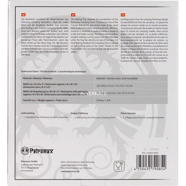 Das Backblech für den Petromax Camping-Backofen ist eine unverzichtbare Ergänzung, um knusprige Frühstücksbrötchen und Pizzen zuzubereiten. Durch die kluge Führung von Unter- und Oberhitze entstehen perfekte Backergebnisse unterwegs mit dem Camper oder Van und überall dort, wo kein Backofen vorhanden ist. Die seitliche Luftführung, entwickelt in der Petromax Drachenwerkstatt, sorgt für eine Luftzirkulation wie im heimischen Backofen. Einfach das Backblech auf der Basisform platzieren und die optimale Hitze erhalten. Mit dem runden Pizzablech aus Edelstahl kann man in Kombination mit dem Camping Backofen auch zwei Gerichte gleichzeitig zubereiten: Auf dem Blech überbacken knusprige Nachos, während unten bereits das feurige Chili köchelt. Mit den beiden seitlichen Henkeln wird die Pizza direkt mit dem runden Blech serviert.Art.-Nr.: 1883438