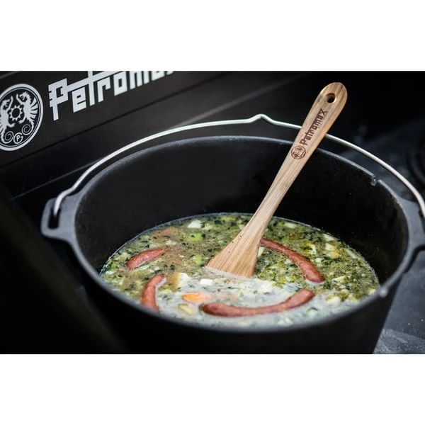 Der Holzspachtel mit Branding ist ein echtes Naturprodukt. Der Kochlöffel aus Holz mit Petromax-Logo wird aus heimischem Kirschholz hergestellt und anschließend geölt. Durch das Einölen erhält das Kirschholz seine charakteristische rötliche Farbe, was die markante Maserung noch verstärkt. Diese Maserung macht jeden Löffel einzigartig und kann daher von der Abbildung abweichen. Dank der flachen Kratzkante, die bis zum Ende leicht gebogen ist, sorgt der Petromax-Holzspatel für das einfache Anheben der Speisen und vermeidet Kratzer auf der Oberfläche von Dutch Oven und Co. Der Griff liegt durch seine abgeflachte und ovale Form gut in der Hand, und der markierte Petromax-Drache definiert den Spachtel zusätzlich mit einem feurigen Charakter. Das eingebrannte Petromax-Logo ist ein Blickfang.Art.-Nr.: 1533532