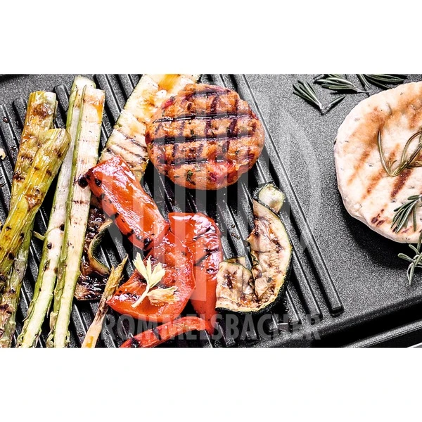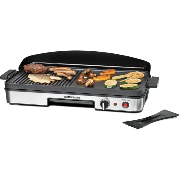 Der Tischgrill BBQ 2003 mit hochwertiger Edelstahl Front kann im Freien, auf Balkon und Terrasse oder im Innenbereich, bei Tisch und in der Küche eingesetzt werden. Er sorgt für ein sicheres und komfortables Grillvergnügen, ganz ohne Rauch und Feuer. Grillen mit Strom bedeutet schnelles Aufheizen bei präziser Temperaturregelung. Das lästige Entsorgen von Asche- oder Kohleresten entfällt. Die Grillplatte aus stabilem Alu-Druckguss mit sehr robuster Antihaftbeschichtung ist in zwei Zonen aufgeteilt. Auf der geriffelten Fläche erhalten Fleisch und Gemüse das typische Grillmuster, auf der glatten Teppanyaki Fläche lassen sich Fisch, Gemüse, aber auch Pfannkuchen und Süßspeisen zubereiten. Die Heizelemente sind direkt in die Grillplatten eingearbeitet, dadurch wird eine optimale Temperaturverteilung erreicht. Die Regelung der Temperatur ist stufenlos über den Drehregler möglich. Zusätzlich hat der Tischgrill BBQ 2003 eine zuschaltbare Turbo-Grillzone für schnelles, scharfes Anbraten. Der integrierte Fettablauf, die entnehmbare Auffangschale, die wärmeisolierten Handgriffe, der abnehmbare Spritz-/Windschutz und die superleichte Reinigung sorgen für den sehr guten Bedienkomfort des BBQ 2003.Art.-Nr.: 1518361