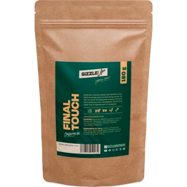 Mit dem SizzleBrothers Final Touch ist man im Endgame der Steakgewürze angekommen. In der verbesserten Rezeptur wartet der finale Kick: kleine schwarze Beeren. Fermentierter Pfeffer! Mehr geht nicht. Die Kombination aus frischen Kräutern, knackigem Meersalz, mildem Kokosblütenzucker und natürlich Pfeffer ist prädestiniert für das “Grand Final”. Im Handumdrehen gibt man die Mischung nach dem Grillen – oder zum Ende des Grillprozesses – auf das heiße Steak, sodass sich die ätherischen Öle entfalten können. Schon bald wird man die Kombination aus süß, pikant und salzig für alles nehmen wollen!Art.-Nr.: 1893340