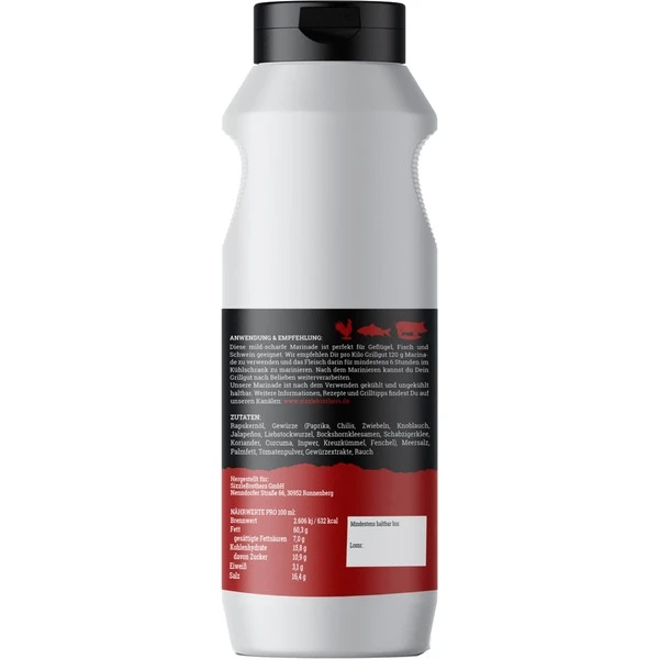 | Zutaten | Rapskernöl, Gewürze (Paprika, Chilis, Zwiebeln, Knoblauch, Jalapeños, Liebstockwurzel, Bockshornkleesamen, Schabzigerklee, Koriander, Curcuma, Ingwer, Cumin, Fenchel), Meersalz, Palmfett, Tomatenpulver, natürliches Aroma, Rauch | ||