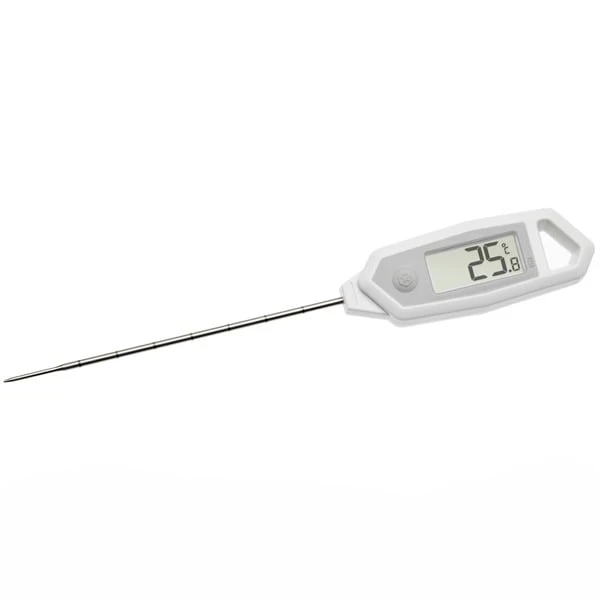 Das handliche digitale Einstich-Thermometer 30.1064 von TFA Dostmann überzeugt durch seine schnelle Ansprechzeit und die hohe Genauigkeit ab ± 0,5°C. Einfach aus der mitgelieferten Schutzhülle herausnehmen, den Edelstahl-Einstichfühler in das Messobjekt stecken und den ON-Knopf betätigen, innerhalb von 4 bis 5 Sekunden erscheint der gemessene Wert im Bereich von -40 bis +250°C. Zum besseren Ablesen der Temperatur kann eine Hintergrundbeleuchtung eingeschaltet werden. Je nachdem, wie das Thermometer gehalten wird, lässt sich das Display per Knopfdruck um 180° drehen und so von Links- und Rechtshändern optimal ablesen. Die gemessenen Höchst- und Tiefstwerte werden gespeichert und sind abrufbar. Das Thermometer schaltet sich automatisch nach 10 Minuten aus. Für Langzeitmessungen kann die Abschaltautomatik deaktiviert werden. Ein Werkszertifikat mit drei Messpunkten (0°C / 100°C / 150°C) ist standardmäßig im Lieferumfang enthalten. So eignet sich das Gerät auch ideal für den Profi-Einsatz, z.B. zur Temperaturkontrolle von Lebensmitteln im Rahmen der HACCP-Verordnungen oder im Labor. Die benötigte Knopfzell-Batterie ist im Lieferumfang enthalten.Art.-Nr.: 1914033
