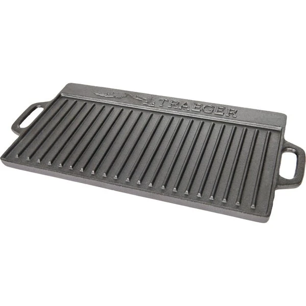Die gusseiserne Grillplatte BAC382 von Traeger verfügt über 2 Griffe. Die gerippte Seite lässt das Fett ablaufen und eignet sich hervorragend zum Anbraten von Steaks, zum Grillen von Hähnchen, Burgern oder Speck. Die glatte Seite ist ideal zum Backen von Pfannkuchen, Rösti oder gegrilltem Käse. Der einzigartige Geschmack des Guss-Geschirrs entsteht durch die konstante Rundumwärme. Dank der vorbehandelten Oberfläche ist die robuste Gusseisen-Platte sofort verwendbar.Art.-Nr.: 1585554
